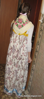 Сегодня масленица пришла, пора печь блины. А в школе у нас сегодня последний день учебы в этом семестре, потом - каникулы. Поэтому праздник Масленицы отмечают в школе нашей именно сегодня. А вчера мы неожиданно вспомнили (как всегда), что нам нужен костюм, так как на ярмарке Маша будет созывать народ, поэтому срочно понадобился сарафан. Ну что же тут поделаешь - пришлось по сусекам помести - нашлась старая штора, вот из нее и смастерила вот такой вот сарафан: