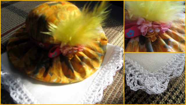 С детства любила читать всякие книжки, романы про дам, про старые времена. И в моем понимании возник некий образ этакой леди, он совсем, наверное, далек от истинного положения вещей, но мне так хочется :-). И я вот так решила, что у каждой леди должна быть шляпка и кружевной платочек. Шучу, конечно :). Это просто прелюдия. Двум девчатам с форума Иголочка я приготовила маленький подарок-сюрприз - это шляпка-игольница и кружевной платочек: