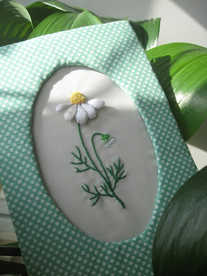Очень хотелось похвастаться, поэтому рамочку делала на скорую руку. Буду искать что-то более подходящее, чем гофрокартон от коробки :), но сочетание этой ткани с ромашкой нравится: