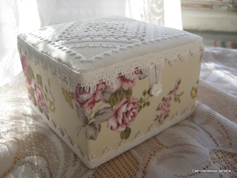 Коробочка нашлась готовая, я ее тканью обтянула (хлопок 100%), обшила хлопковым кружевом, внутри - ткань-бязь, с синтепоном, поэтому мягонькая шкатулочка :)))).