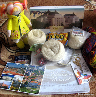 Но ведь гостья из Таллинна приехала не с пустыми руками ,а просто с царскими подарками - здесь и сладости из Эстонии, и ножницы-павлинчики, и магнитики на холодильник, и бусинки, и даже счетчик рядов: