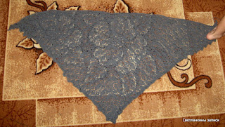 Осталось только заблокировать, о блокировке я подробно писала в прошлый раз.Просто напомню пару моментов - шаль замочить в воде с мягким мыльным растворе (я использую обычный шампунь), после этого хорошо прополоскать, легонько отжать, разложить на специально подготовленном месте (одеяле, паласе, резиновом коврике, диване), \растянуть и закрепить булавками, ждать полного высыхания, снять все булавки, любоваться готовой шалью :-).