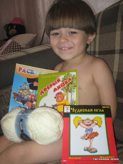 Ну и как же без подарков, так как Миша позволяет делать фото только с собой, то получилось вот так - раскраски Мише, ниточки мне (маркеры для вязания и счетчик рядов тоже мне, но они в кадр не попали :) ), Маше - наборчик, он так ей понравился, что на фото уже только обложка, а Маша уже вышила одну руку :):