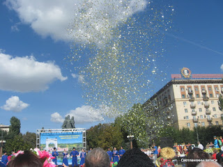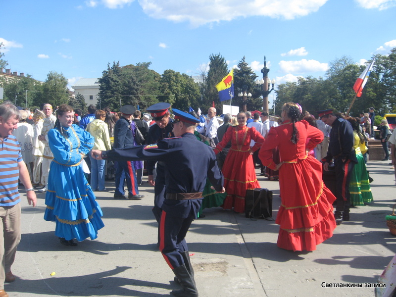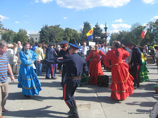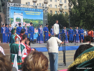 А на площади у фонтана уже начался Всероссийский фестиваль национальных культур. На сцене выступает Казачий ансамбль