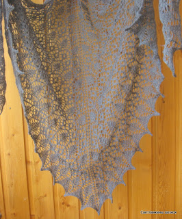 by Evelyn A. Clark. Пряжа - Merino Extra Fine 750м/ 50г, состав - шерсть 100%, вязала в 2 нити, ушло почти 2 моточка, спицы 3,5мм. Ниточки очень нравятся, это уже третья шалька из таких ниточек, сначала была белая, потом черная, а теперь - серая. Вторую схему вязала 6 раз, размер получился не маленький - высота метр, размах - два метра.
