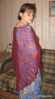 Кстати, хочу сказать - эта шаль конечно не пушинка, но в этом то её и прелесть :))), как раз для осени или зимы, закутаться и дома сидеть, чаек попивать, или на работе погреться. Я до этого ни разу не вязала из такой толстой для шали пряжи, а результат мне понравился :).