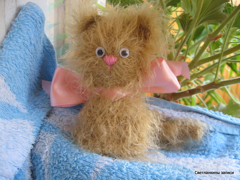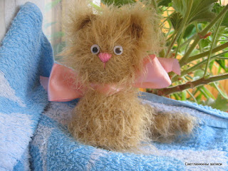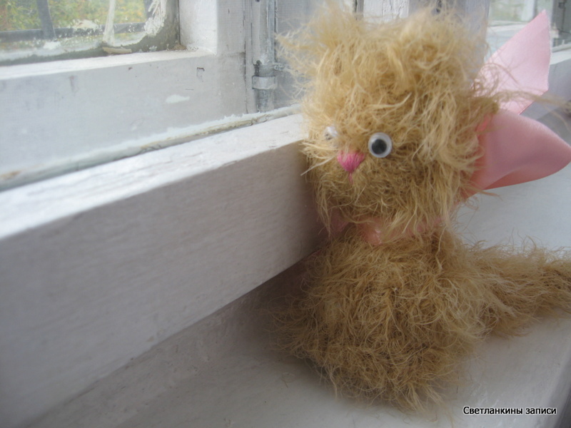 Вообще, с этим котенком произошла одна история. Купила я эти ниточки еще во времена своего увлечения вязания игрушек. Очень мне они по ощущениям понравились, и так они мне понравились, что тут же придумался котенок, связанный спицами. Почему именно спицами - так кто же его знает, вот так мне в голову пришло. Придумался, то он придумался, да так и не связался. Так и жил он в моей голове :))))) И как пишут в романах:"Прошло время...", и тут на Иголочке объявили (ну в смысле я и объявила) о начале конкурса "Кошачий концерт", вы думаете котенок захотел вылезти из моей головы, а вот и нет. Ему и там было хорошо. И вот сроки сдачи конкурсных работ уже подходил к концу, и вдруг этот Рыжик захотел появиться на свет - наверное, его время пришло. И за один день появилось вот это пушистое рыжее чудо :-). Вон он на дождик за окном смотрит:
