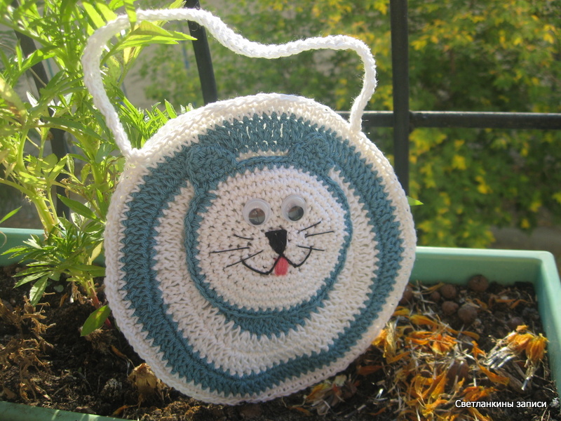Сумочка связана из Питерской Фиалки и Хлопковой Пехорки, подарена, и теперь живет у одной очень хорошей девочки :-). Сумочка связана по мотивам сумочек Антонины.