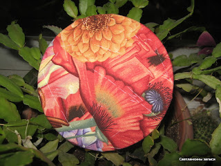 На нижней половинке - летняя ткань от Наташи из блога Подружки-рукодельницы, которую она мне прислала в маковой конфетке, кстати, ленточки тоже от неё, по цвету они прекрасно были подобраны в тон к тканюшке. Наташа, спасибо!