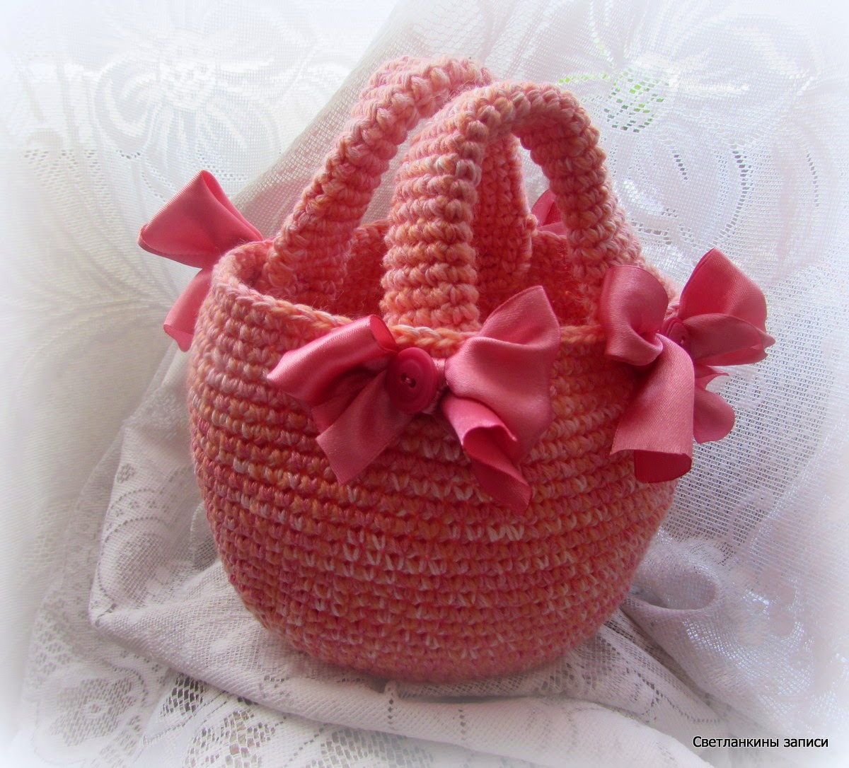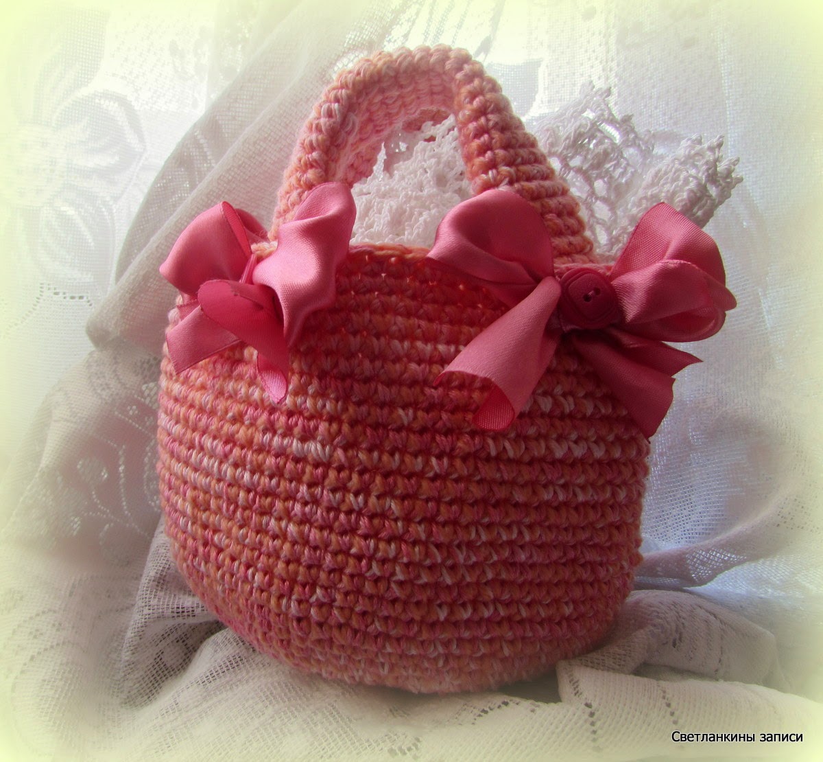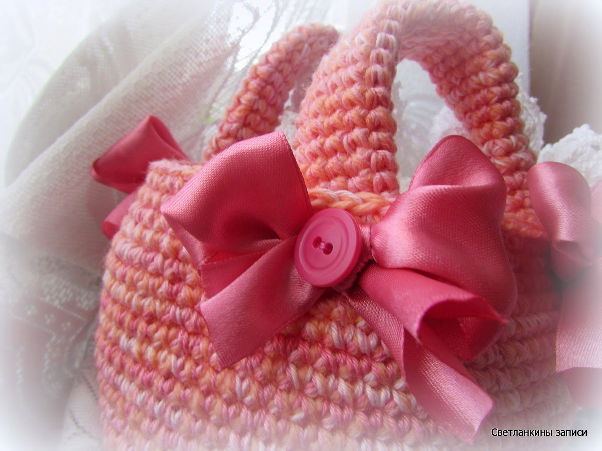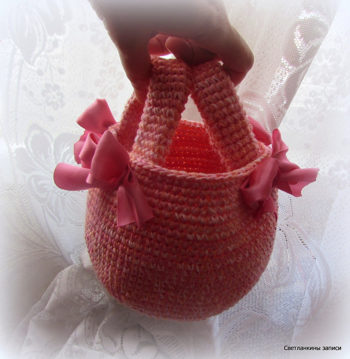 УдалитьСветлана, красивое розовенькое лукошко, украшено так озорно! Вяжу такое же, у меня тоже на ручки ниток не хватило)))