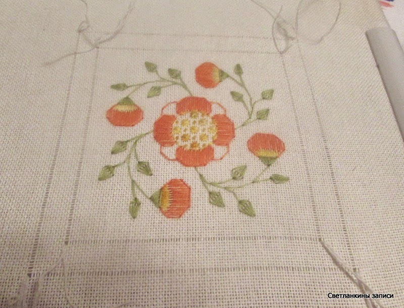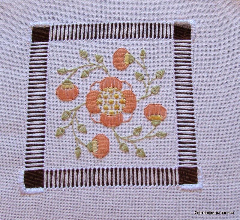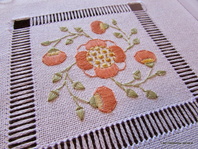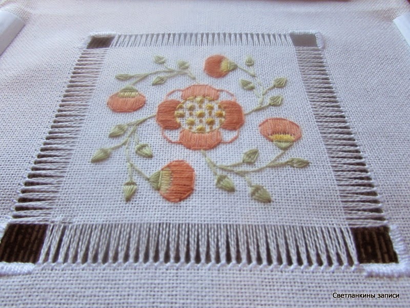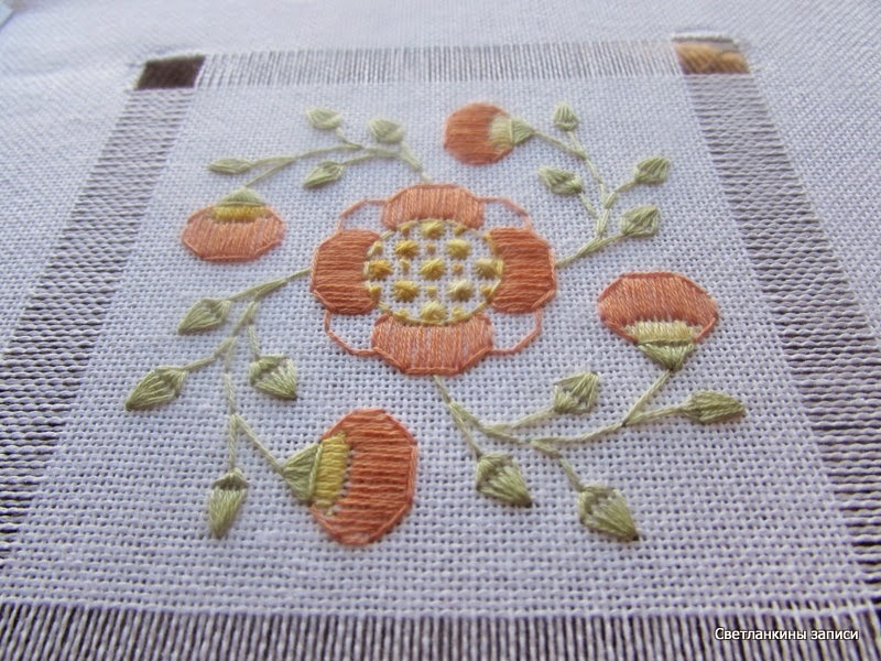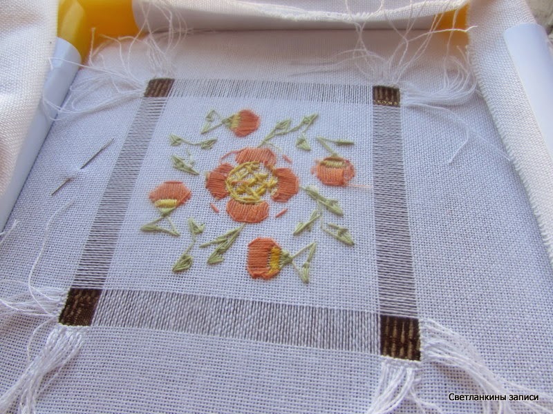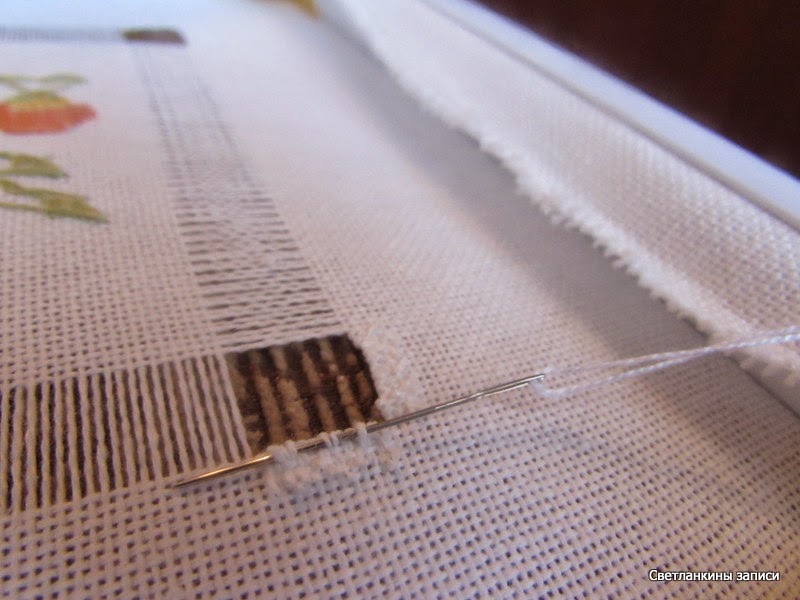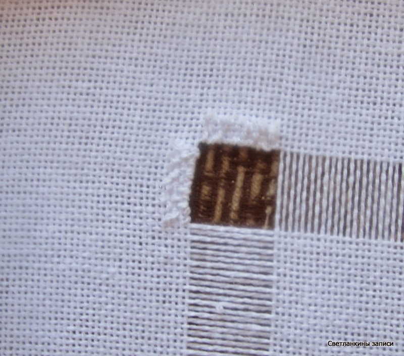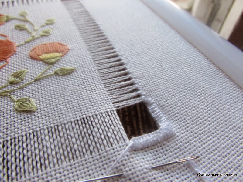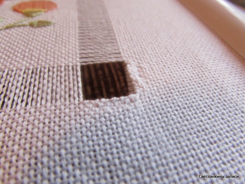 Самый простой способ, который я встретила - это вышить в уголках (по схеме) петельным швом, а потом как в хардангере аккуратно разрезать нити и выдернуть нужное количество ниточек. Но мы не ищем легких путей ))) Поэтому будет куча фоток (не всегда хорошего качества - вышивала-то я вечером в основном)