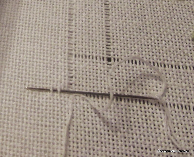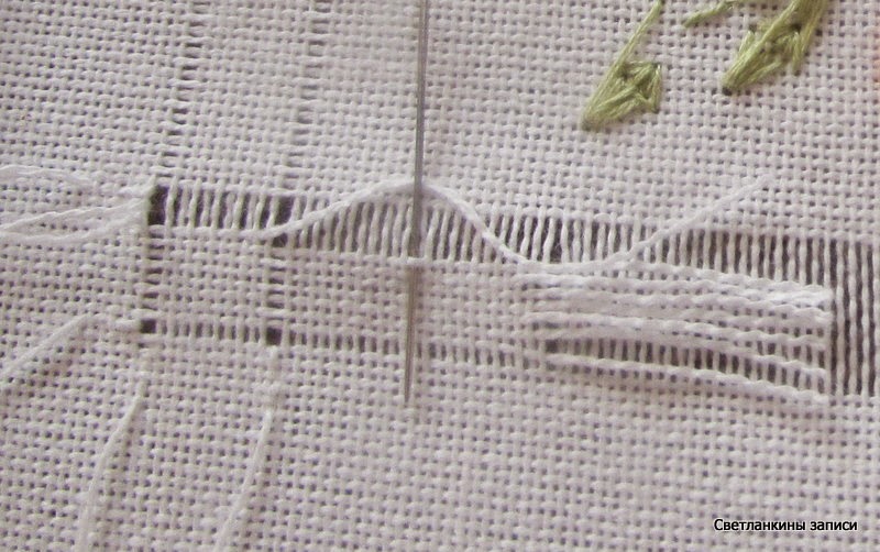 И начинаем шить мережку, группируя по три нити. вводим иглу справа налево: