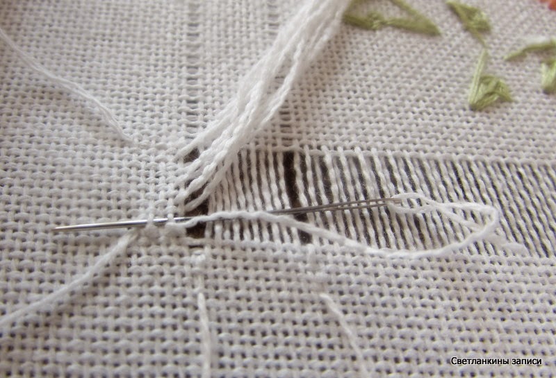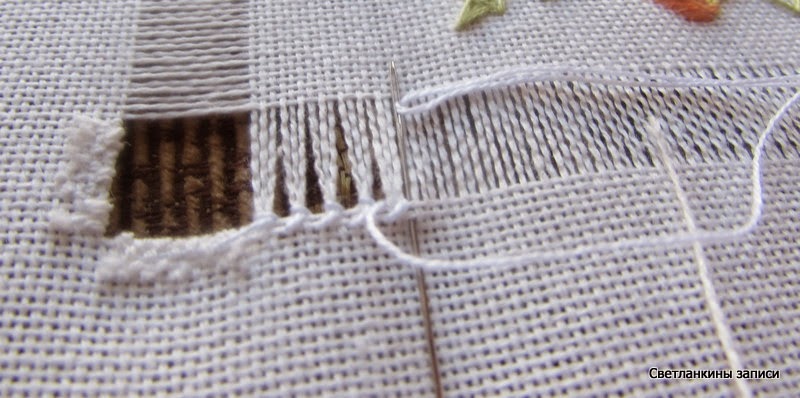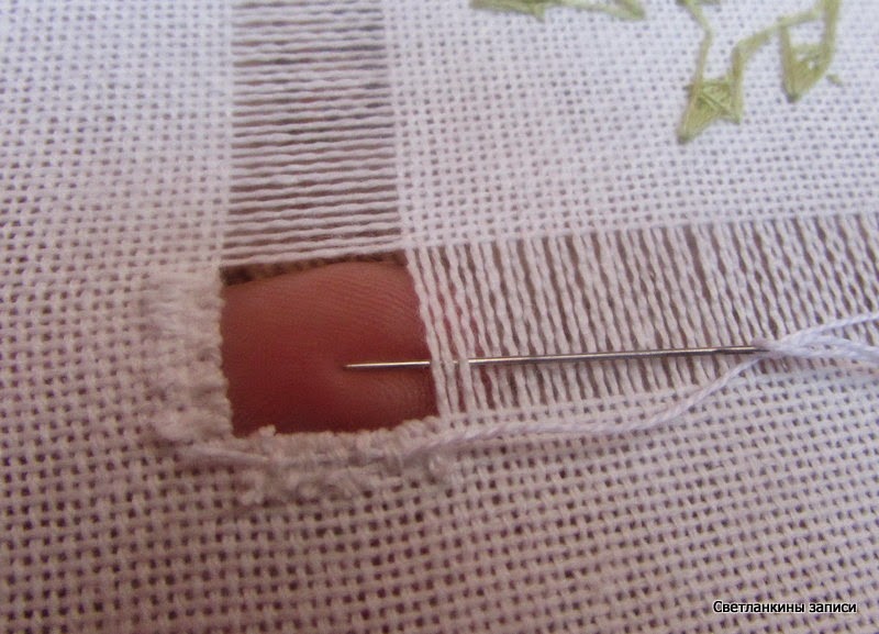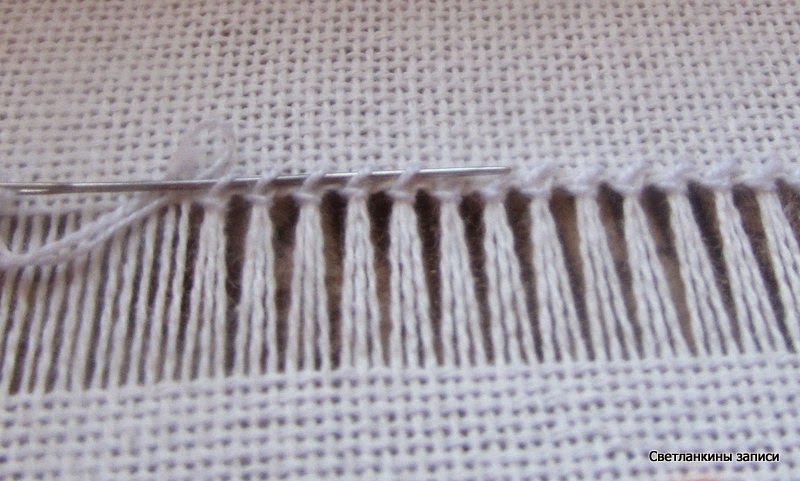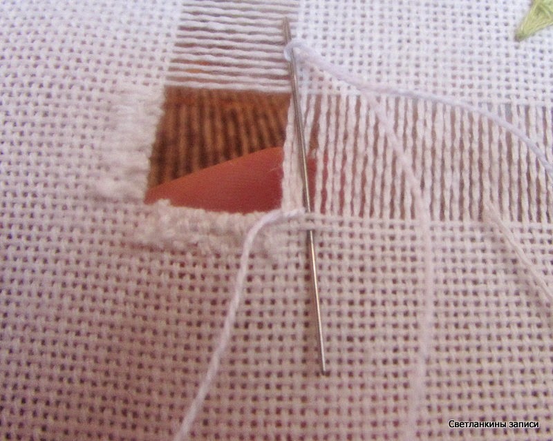 Потом аккуратненько вытягивала каждую ниточку:А потом каждую ниточку аккуратно прятала на изнанке с помощью иголки: