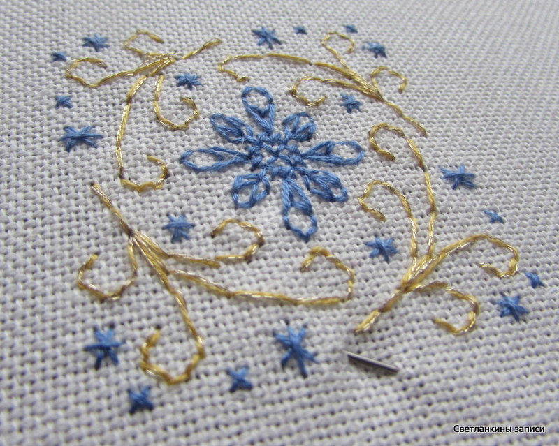 Сначала вышиваем центральную снежинку (здесь крестики, шов назад иголка, длинные стежки):
