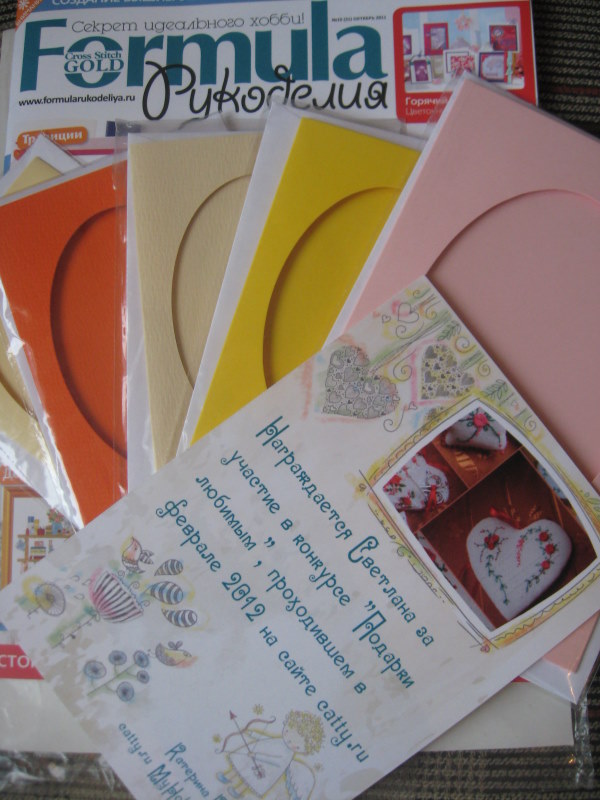 Сначала об очень приятном - мне пришел журнал и заготовки для открыточек с форума Catty.ru за активное участие в работе форума и в конкурсе "Подарки любимым", я так рада:):