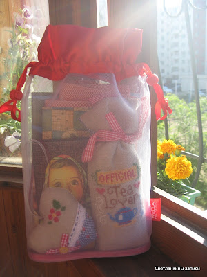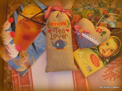 Я уже писала, что мы с ней решили обменяться, к ней полетел фиолетовый комплект, а я получила очень миленькое и аккуратное сердечко и целый мешочек с вышивкой, и не пустой, а с чаем (как на нём и написано :)))), а чай - клубника со сливками: