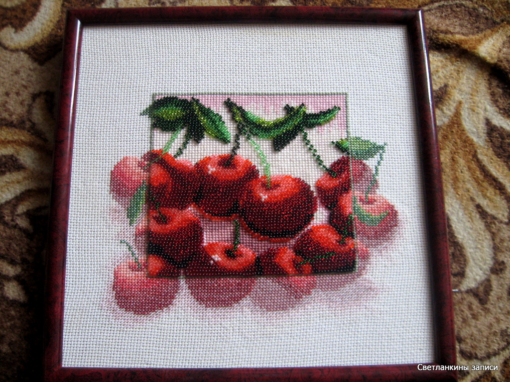 А это главная составляющая приза, вышивка бисером и мулине, знали бы вы, как это выглядит замечательно на самом деле! Очень аппетитные вишни :)))))