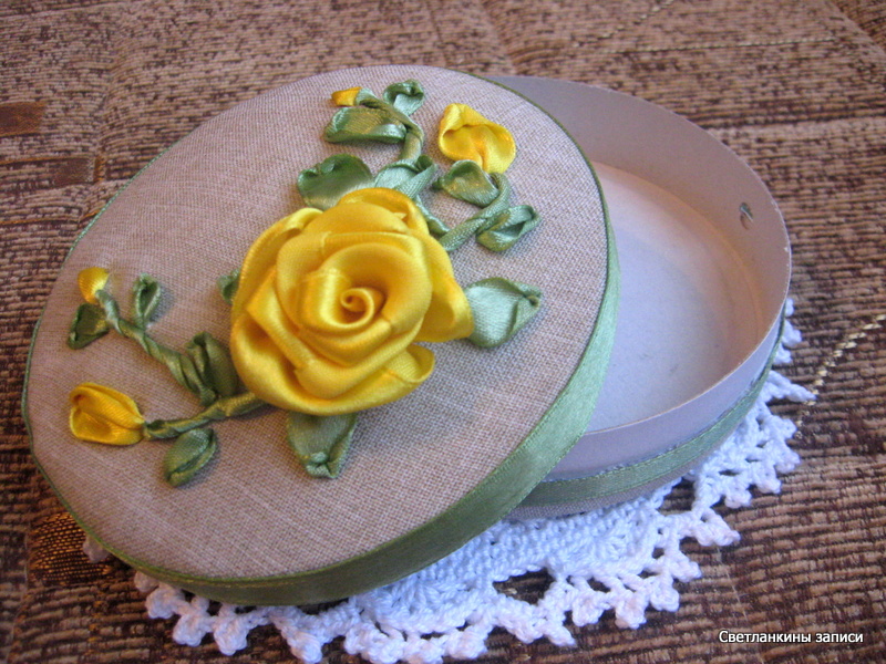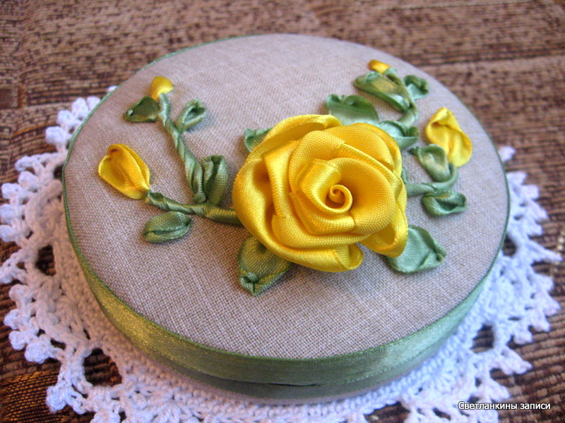 Где тишина необычайная, Есть небольшой уютный дом И перед домом - роза чайная. Над нею веера стрекоз - Как опахала изумрудные; Вокруг цветы струят наркоз И сны лелеют непробудные. В пруде любуется фасад Своей отделкой прихотливою; И с ней кокетничает сад, Любуясь розою стыдливою. Но дни и ночи, ночи дни - Приливы грусти необычные. И шепчет роза: "Мы - одни С тобою, сад мой, горемычные"... А между тем, с огней зари И до забвения закатного, В саду пигмеи, как цари, Живут в мечте невероятного. Они хохочут и шумят, Ловя так алчно впечатления; Под их ногами сад измят: Бессмертье - часто жертва тления!.. Что станет с розой, если весть О ней дойдет до них случайная?.. И не успевшая расцвесть, Спешит увянуть роза чайная... 1909 Немного грустное стихотворение, но с чайными розами вообще и приметы связаны какие-то грустные, а они мне нравятся. Решила тут попробовать розочки покрутить. А чтоб без дела не лежали, смастерила вот такую маленькую шкатулочку-коробочку. Вообще-то это коробочка от сыра треугольничками, как-то оставила, вот и пригодилась. Отправилась коробочка к одной хорошей девушке, как сюрприз и как знак внимания :-). Внутри ничем не стала оформлять, осталась она там девственно белой: Крышечка набита немного синтепоном, и ее можно использовать как игольничку, а внутрь положить парочку моточков мулине. Отчитываюсь этой шкатулкой-игольницей в совместном проекте SAL "Игольницы и Ко" у Анжелики, второй отчет уже был 21 июля, я как всегда опаздываю ))): | |