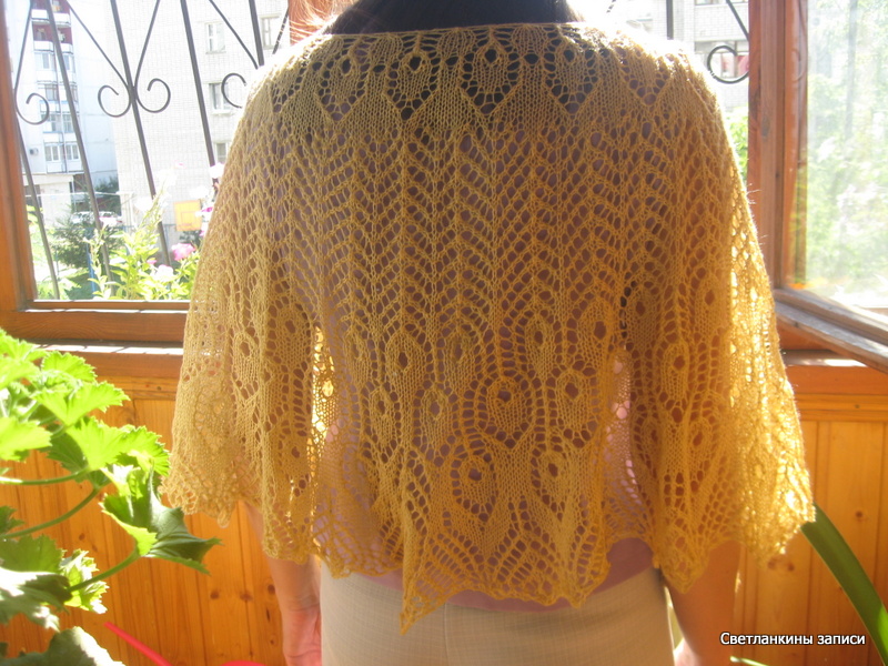 Вязала спицами 3,5 мм, из пряжи Лидия п/ш, в 2 нити (1613 м/100г) , размер - по верхнему краю 100см, высота 52 см.