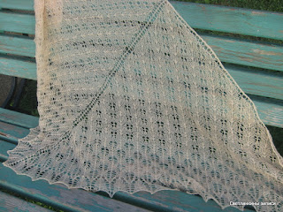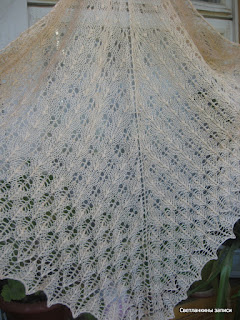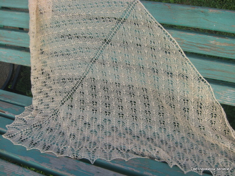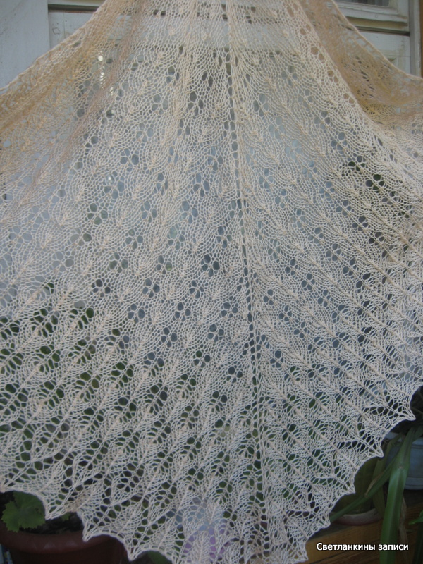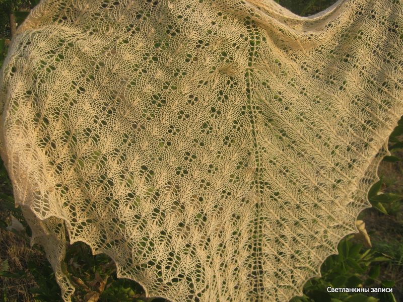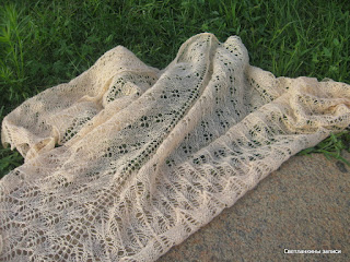 У Лены снова сочинилась чудесная шаль, как тут пройти мимо? Почему-то шаль, которая получилась у меня, стойко ассоциируется в моей голове с августовской травой, наверное, цвет пряжи виноват :-). Вязала из семеновской Лидии (50 % шерсть, 50% акрил) 1680 м/100г, в 2 нити, ушел почти весь моточек, осталось немножко, спицы 3,5 мм, цвет пряжи - ванильный, такой светлорозовый. Реального цвета ни на одном из фото не получилось, к сожалению. Первое фото - без солнышка, здесь цвет более похож, второе - на солнышкеВторой узор повторяла 8 раз, третий узор - 5 раз. Размер - высота 90 см, размах 190 см.