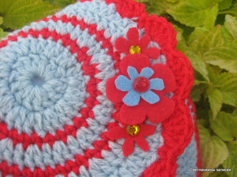 В последнее время у меня какой-то в голове бзик - надо потратить остатки пряжи от остальных проектов, вот и для этой сумочки пошли полушерсть Аэлита Семеновской фабрики (остатки от палантина), и акрил неизвестного происхождения (потеряла этикетку). Это-то и сыграло со мной злую шутку, сумочка получилась чуть меньше, чем у Тони, потому что пряжа кончилась, поэтому и цветочки из фетра, и обвязка немного другого оттенка. Но тс-с-с-с-с - это секрет, вы ведь никому не скажете ;-).