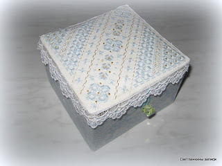 Всё мечтаю о снеге, а у нас всё дождь. Хотя с сегодняшнего дня обещают похолодание. Из-за этой слякотной погоды детки болеют, вот и мы с Мишей опять на больничном с дурацким кашлем. У меня дурной характер и богатое воображение, поэтому когда заболевают детки, я начинаю себе что-то придумывать. И чтоб отвлечься мне надо чем-то руки занять. Вот вчера и заняла руки, тем более вышивка была готова давно. Ее мы вышивали в ноябре в авантюре на Иголочке. Меня попросили провести авантюру с хардангером, а я что-то расстаралась, слишком большую схему придумала, до финиша пока дошло только два человека. Ну что я всё говорю и говорю, пора и фото показать...Вышивка - ниточки Finca Perle №12 и №8 светло-голубого цвета, металлик гаммовский, бисер золотистый.